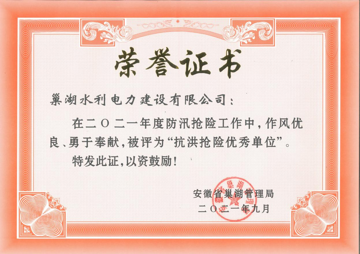 公司榮獲安徽省巢湖市管理局頒發(fā)的“抗洪搶險(xiǎn)優(yōu)秀單位”榮譽(yù)證書