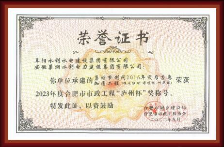 巢湖節(jié)制閘2016年災(zāi)后應(yīng)急加固工程榮獲“廬州杯”獎稱號