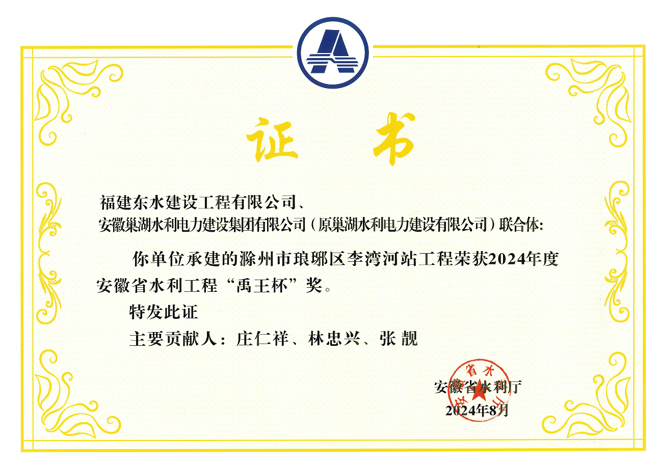滁州市瑯琊區李灣河站工程榮獲“禹王杯”榮譽證書